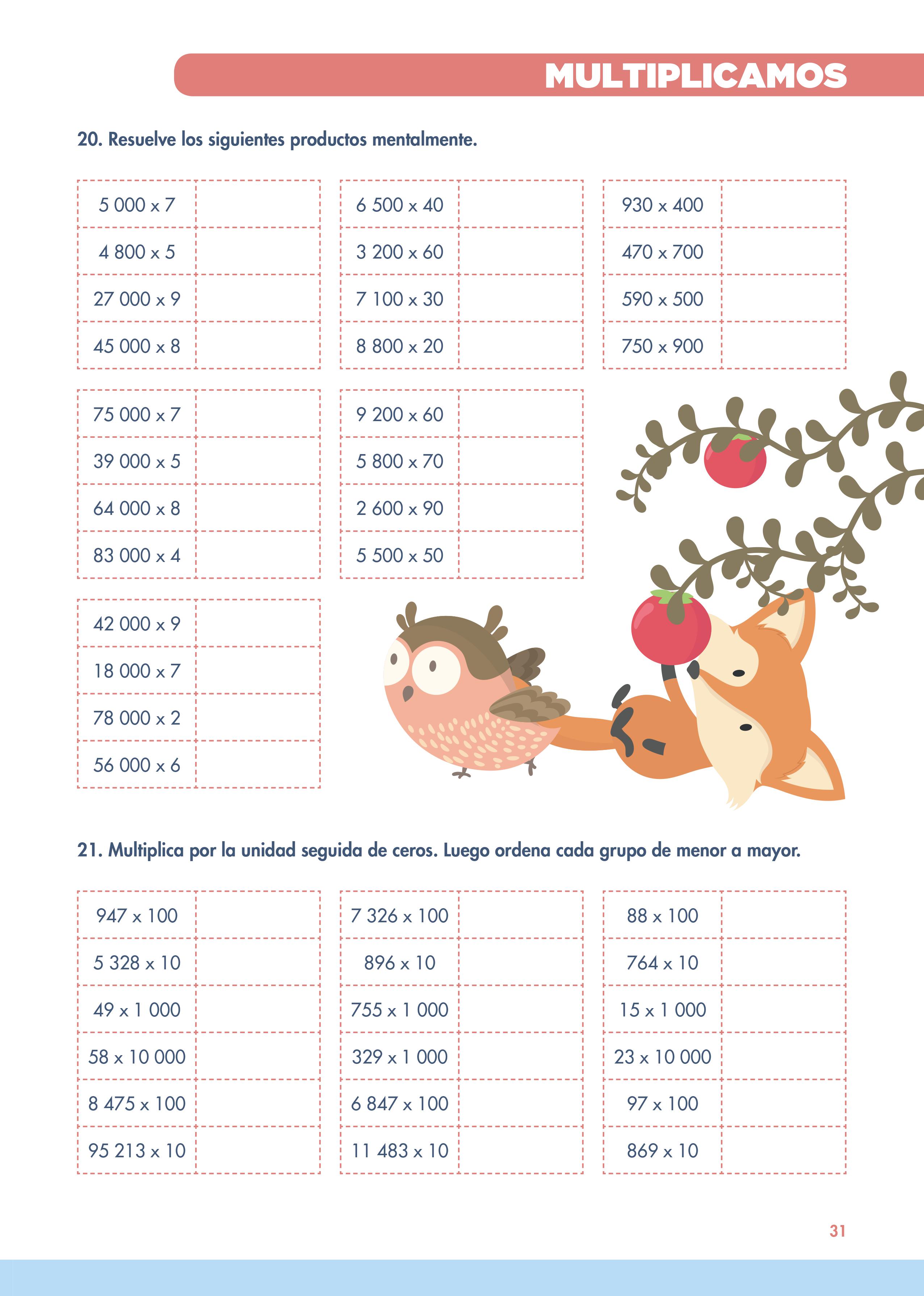 Resolvemos multiplicaciones mentalmente. En el primer ejercicio cuando nos encontramos por ejemplo 4 700 x 6 tenemos que intentar y trabajar para que este tipo de cálculos lo hagan mentalmente. En este caso sería: