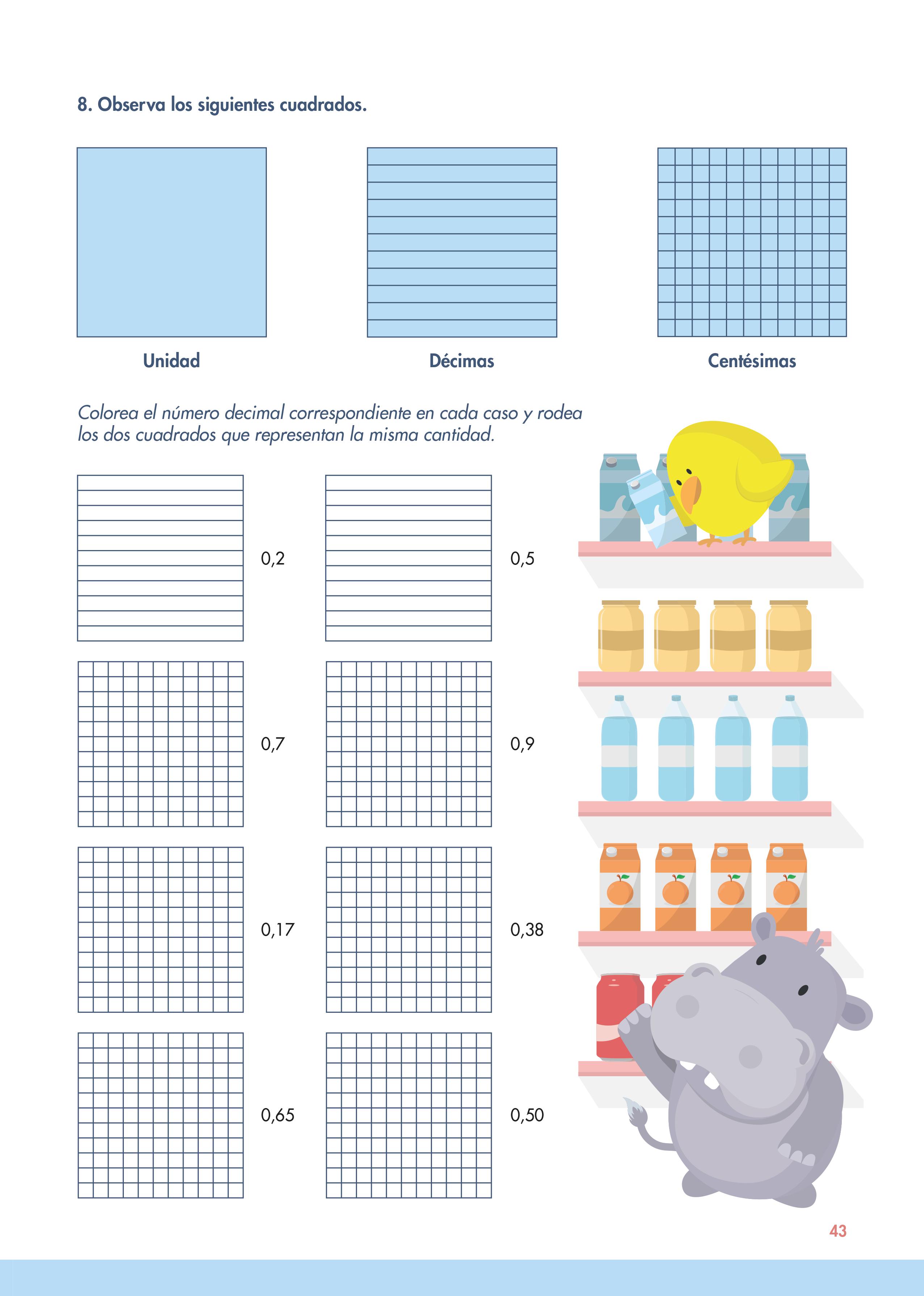 En esta página se empieza a trabajar con los decimales. En el ejercicio que propongo pretende que los alumnos vean gráficamente la equivalencia de las décimas y centésimas y entiendan la relación que hay entre ellas.