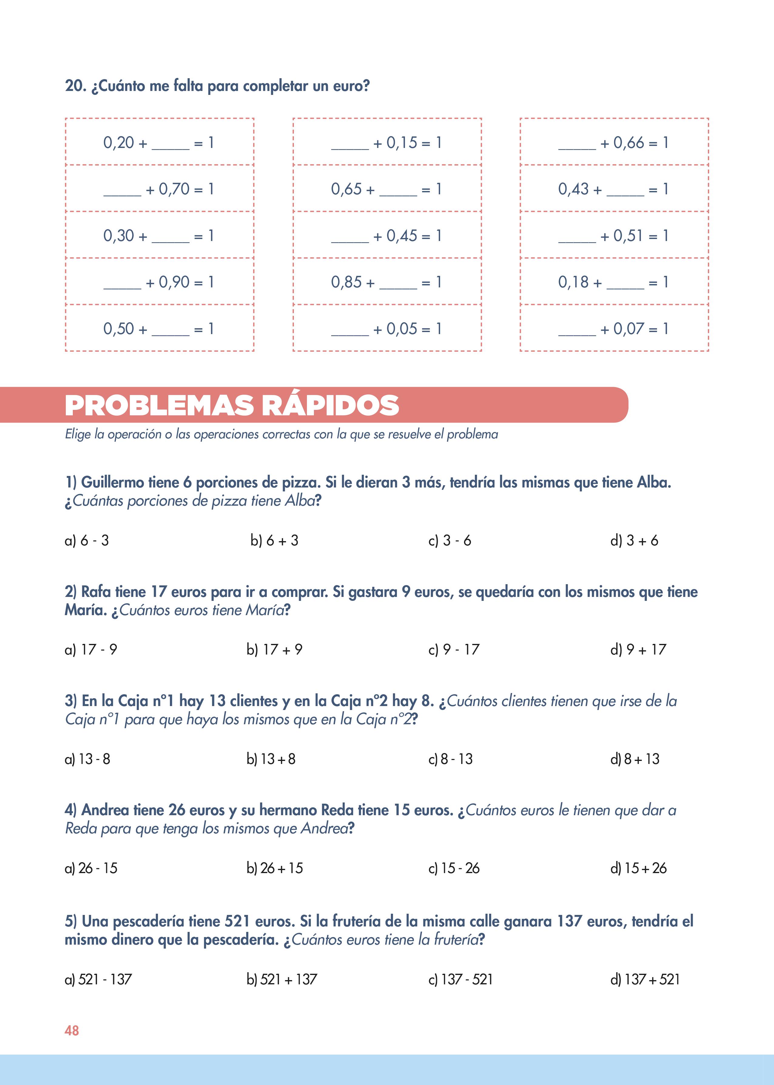 En esta página nos encontramos con un ejercicio de ordenar problemas y otro semejante a los anteriores de numeración en el que al número central tienen que sumarle o restarle lo que le van indicando. Ojo que en este aparecen décimas y centésimas.