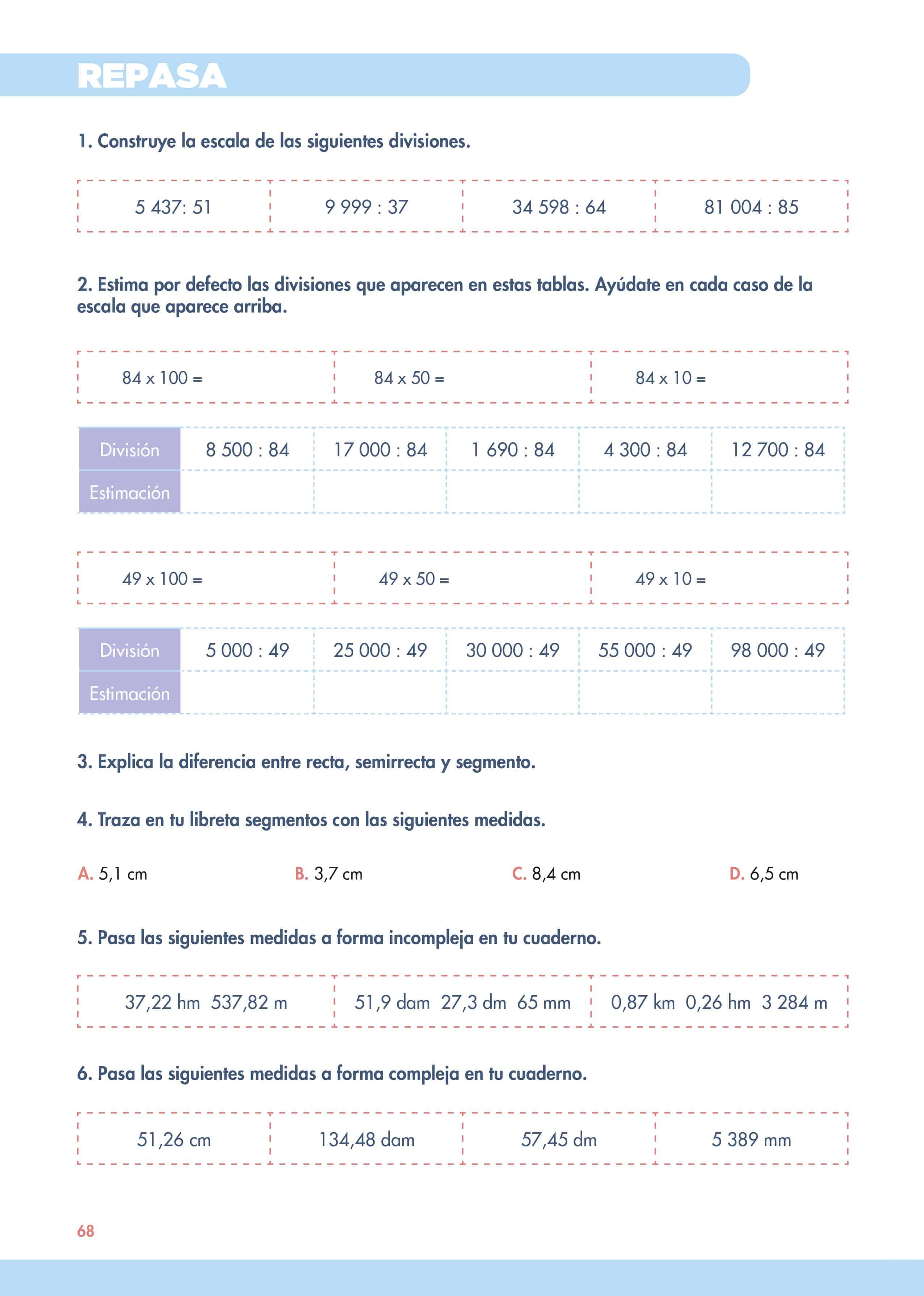 En el tercero tienen que trazar diferentes líneas con las medidas que aparecen, pero ¡ojo! las medidas están en diferentes unidades y deberán pasarlas a centímetros. Por último tienen que ordenar de menor a mayor las medidas.