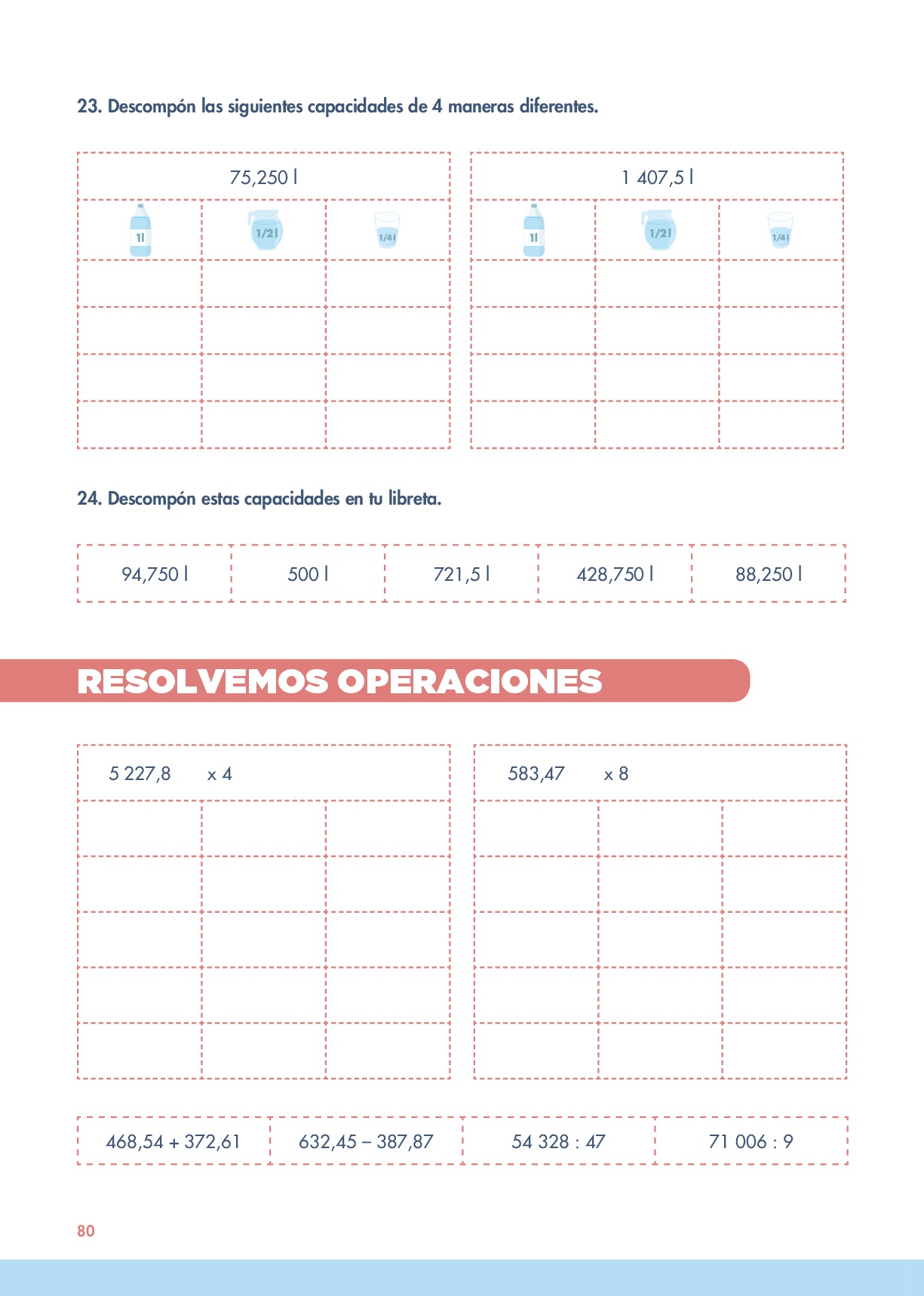 Y para terminar dos ejercicios en los que partiendo de un determinado peso dado en kilogramos o gramos los alumnos tendrán que descomponer de distintas maneras utilizando pesas de kilo, medio kilo o de cuarto de kilo.