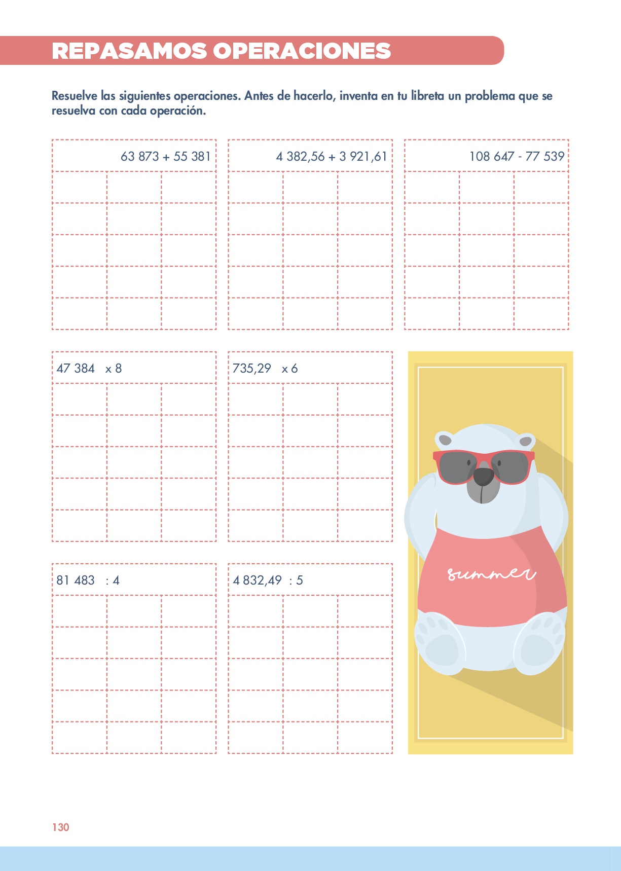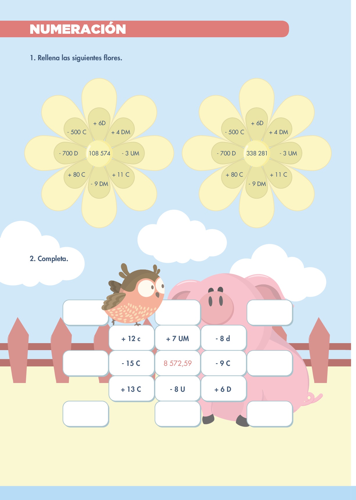 Comenzamos el repaso general con un poco de numeración. En este caso tienen que resolver pequeñas sumas y restas pero excepto el número central todos los demás aparecen en diferentes unidades que los alumnos deberán controlar.