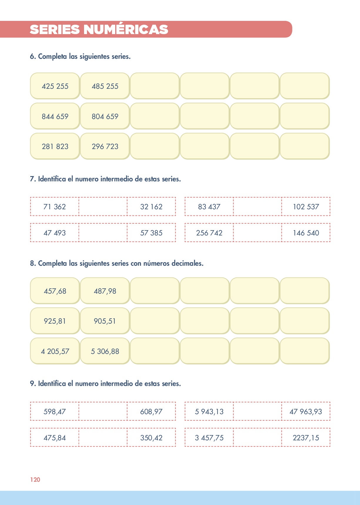 En esta página se repasan las series numéricas con números naturales y decimales. Aparecen también series numéricas intermedias en las que el alumnos debe calcular la diferencia entre los dos números que hay para luego con su mitad sumarla o restarla a uno de los números.