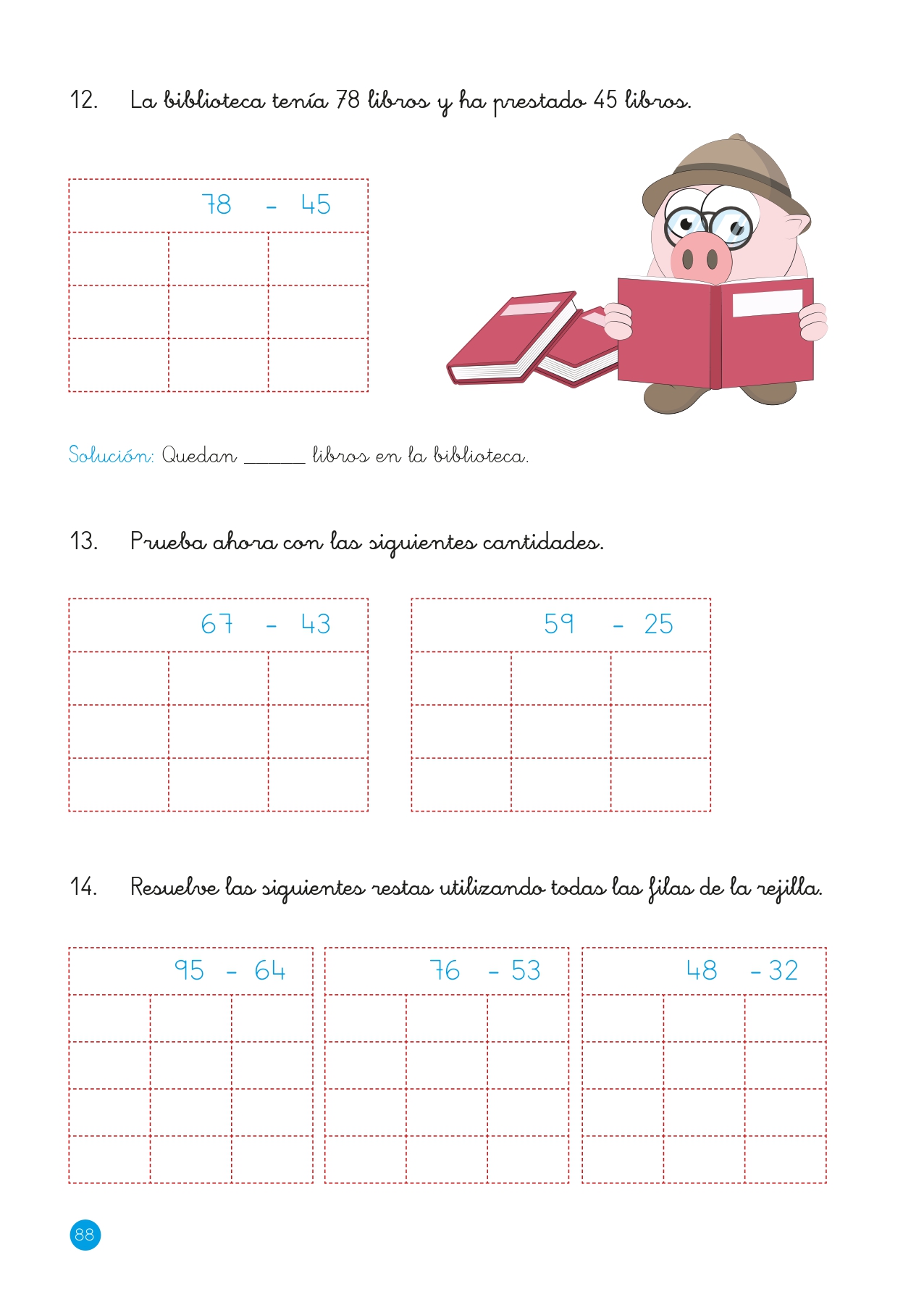 En esta página también tienen que resolver restas pero con una mayor dificultad. Es una resta como diríamos en el algoritmo tradicional “con llevadas” aunque recuerdo que estas no existen en el algoritmo abn.
