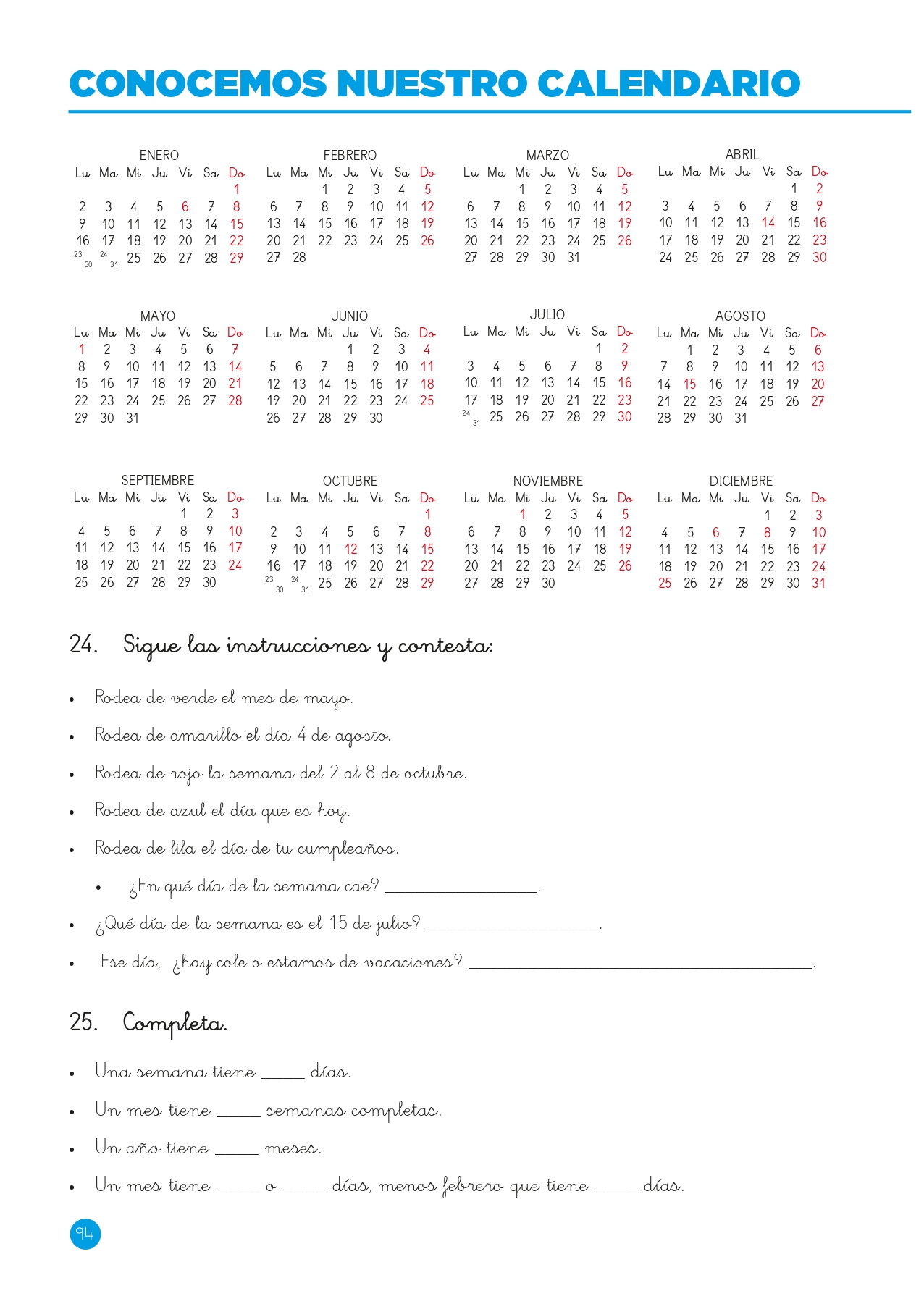 Trabajamos el calendario. Partiendo y visualizando un calendario tienen que resolver diferentes cuestiones.