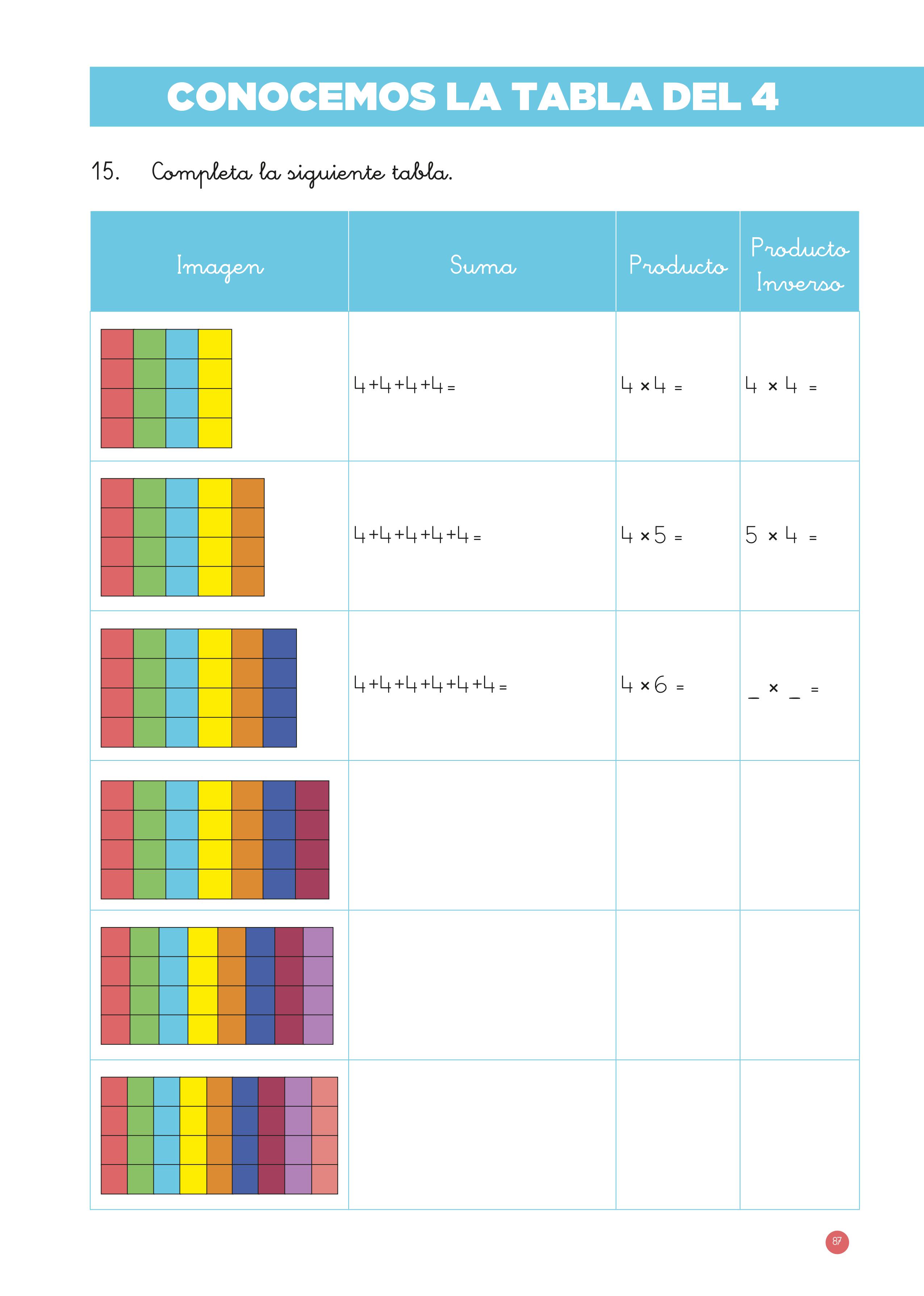 En esta página trabajamos la tabla del 3. Se la presentamos como suma de sumandos para luego trabajar la tabla y su inversa.