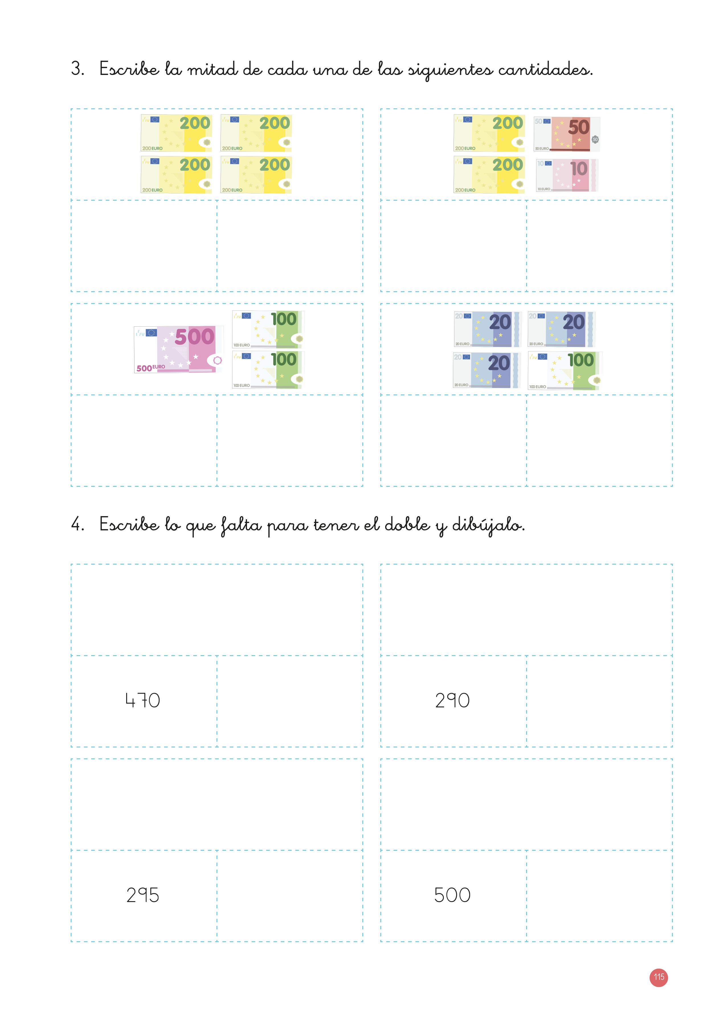 En el primero el alumno tiene que repartir la cantidad que tienen arriba en dos cantidades iguales. Para ello tendrán que calcular la mitad.