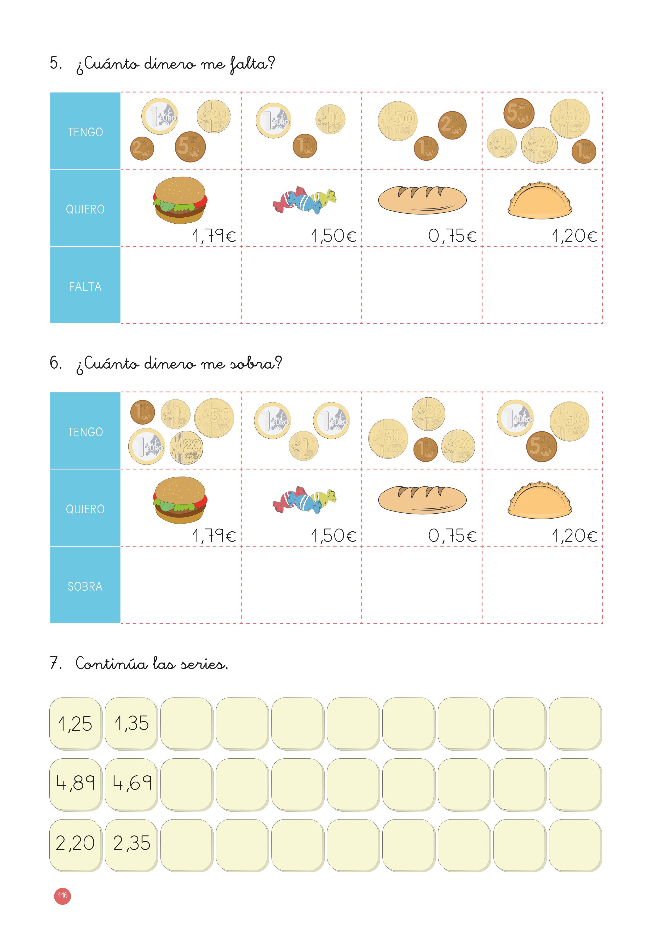 En esta página nos encontramos con cuatro problemas relacionados con el dinero. Tendrán que observar los precios del anuncio para poder resolver los problemas.