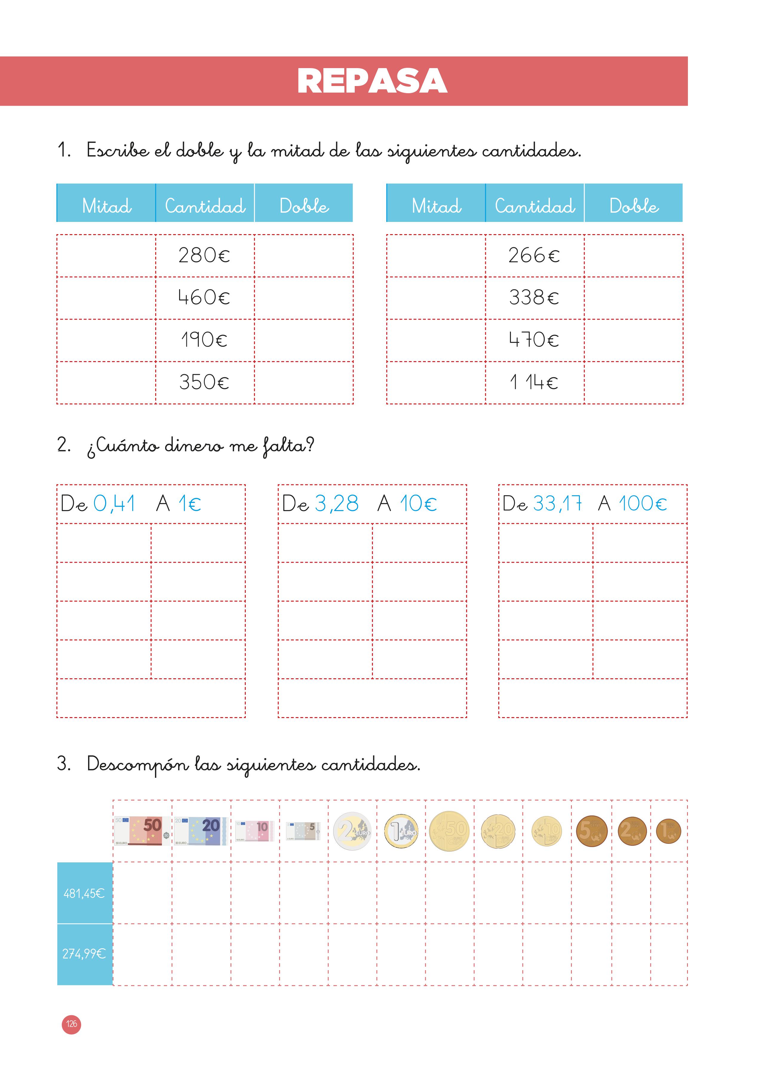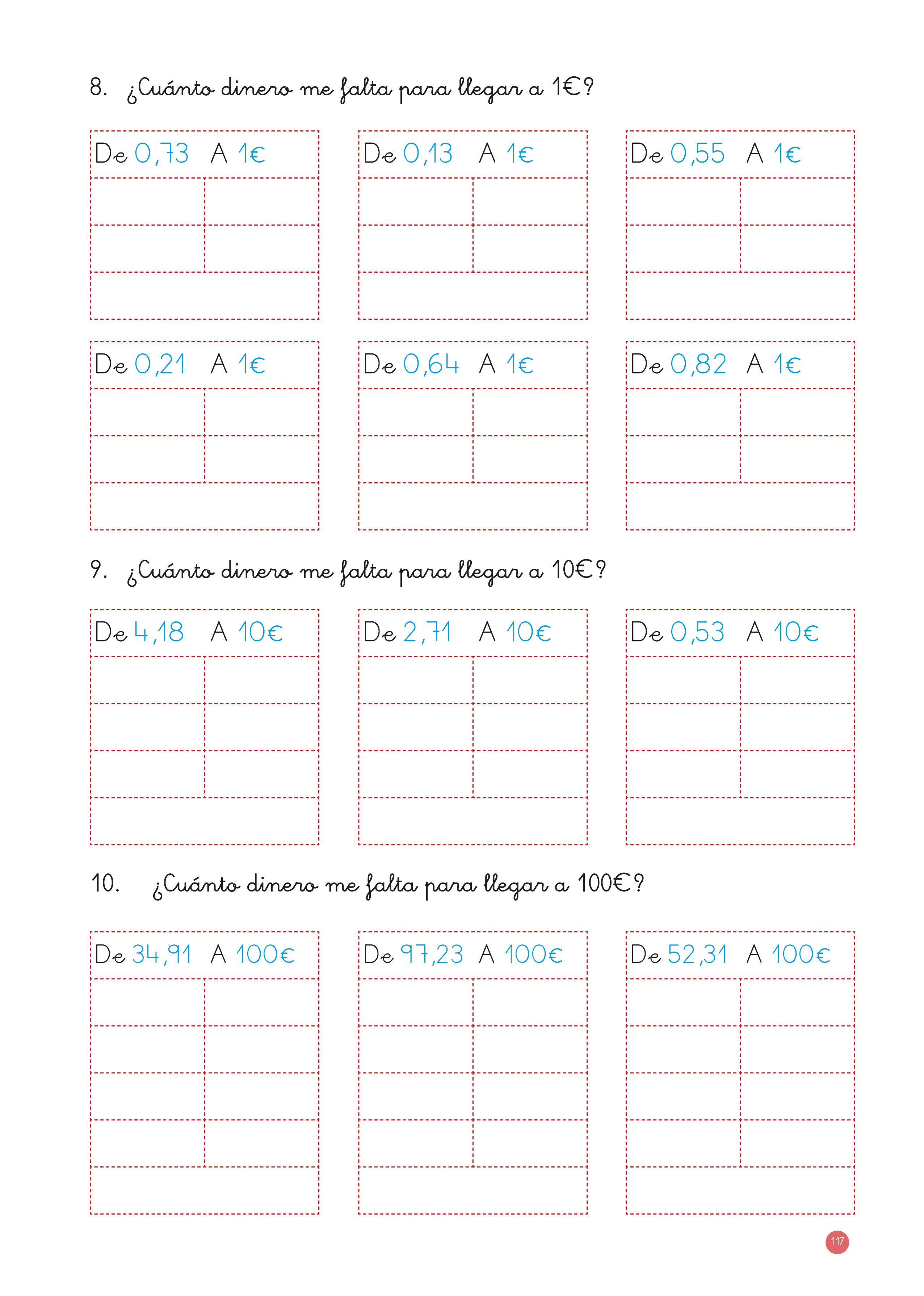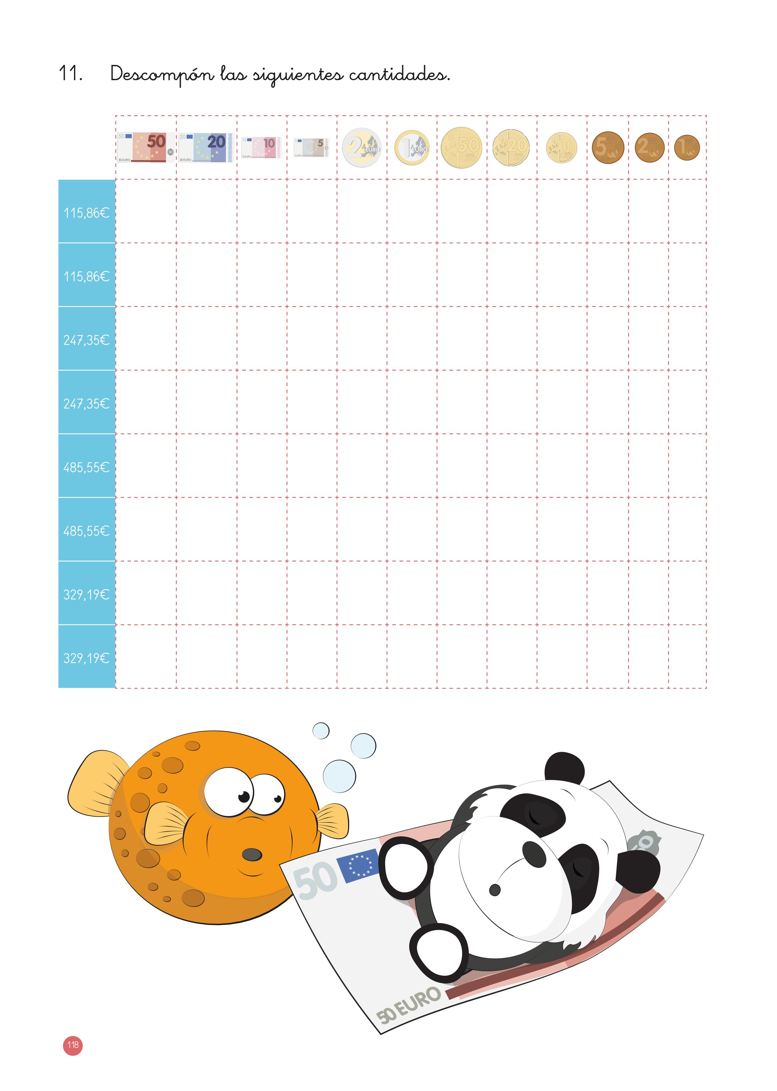 En esta página vamos a trabajar la descomposición de dinero utilizando los céntimos. Las cantidades aparecen repetidas ya que se pretende que el alumno descomponga una misma cantidad de dos maneras diferentes.