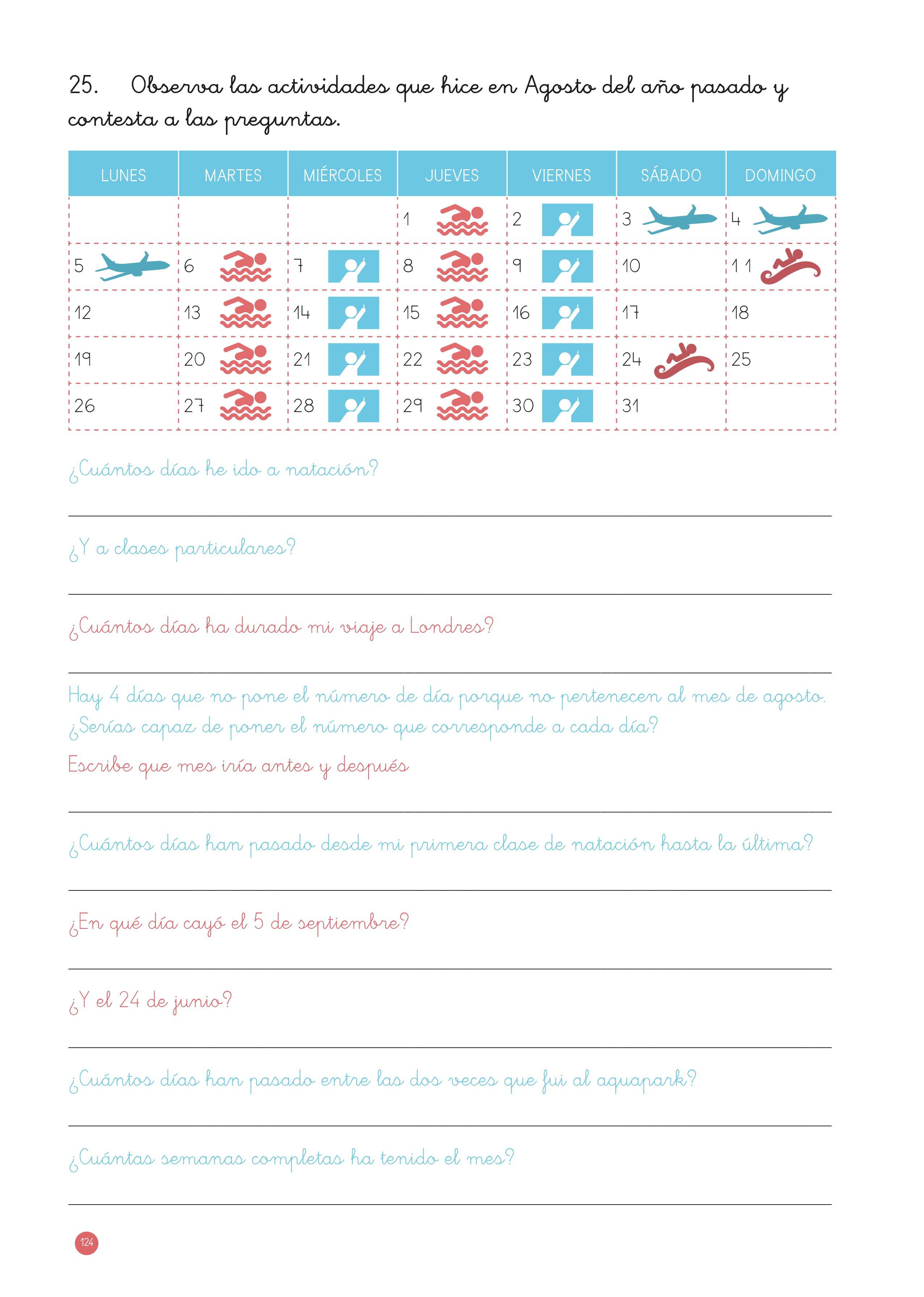 Para terminar con el calendario, el alumno observando las actividades que se han realizado en el mes de agosto, tiene que responder varias preguntas.