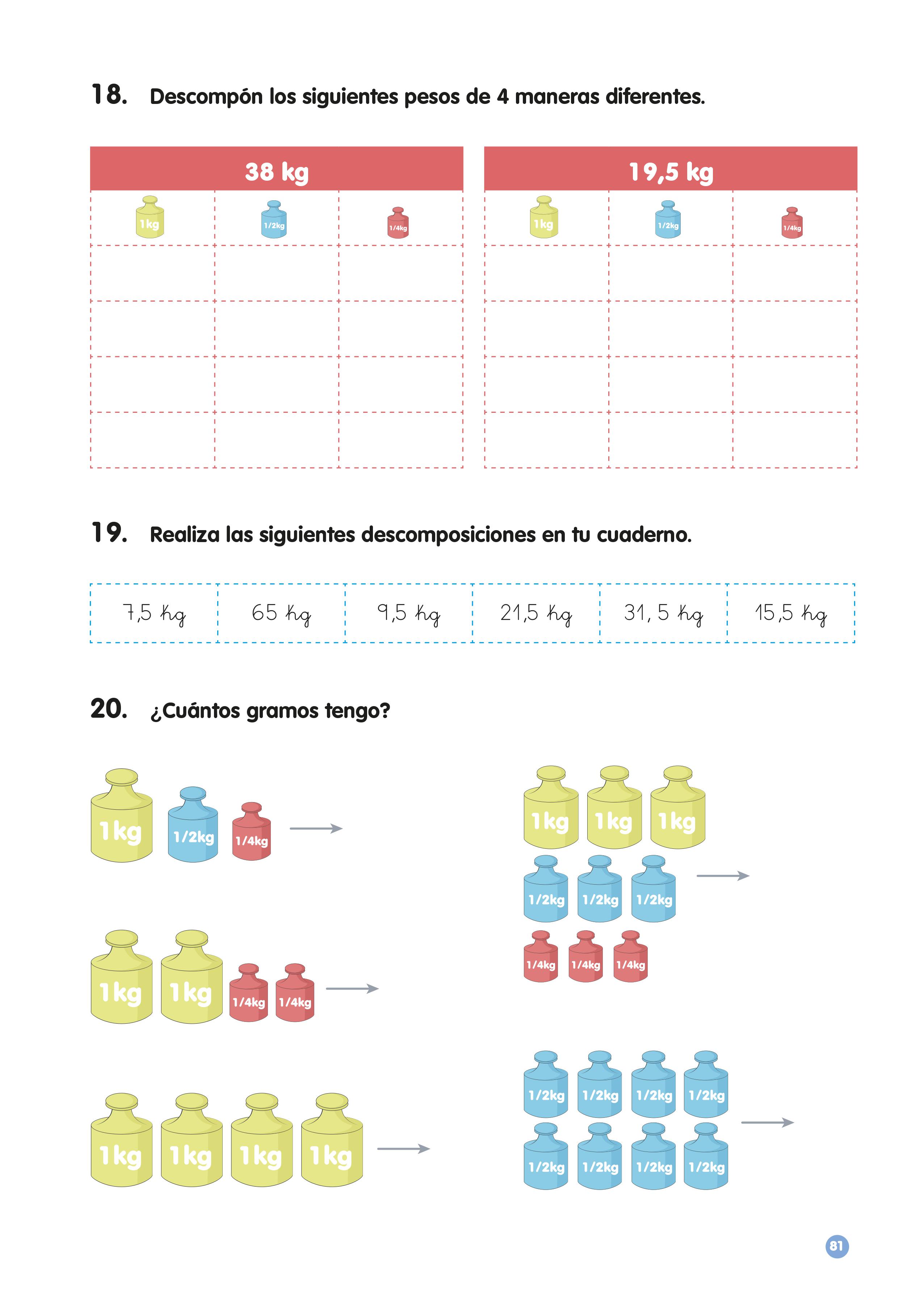 Es el turno ahora de descomponer un peso en kilogramos utilizando pesas de 1 kg, 1/2 kg y 1/4 kg.