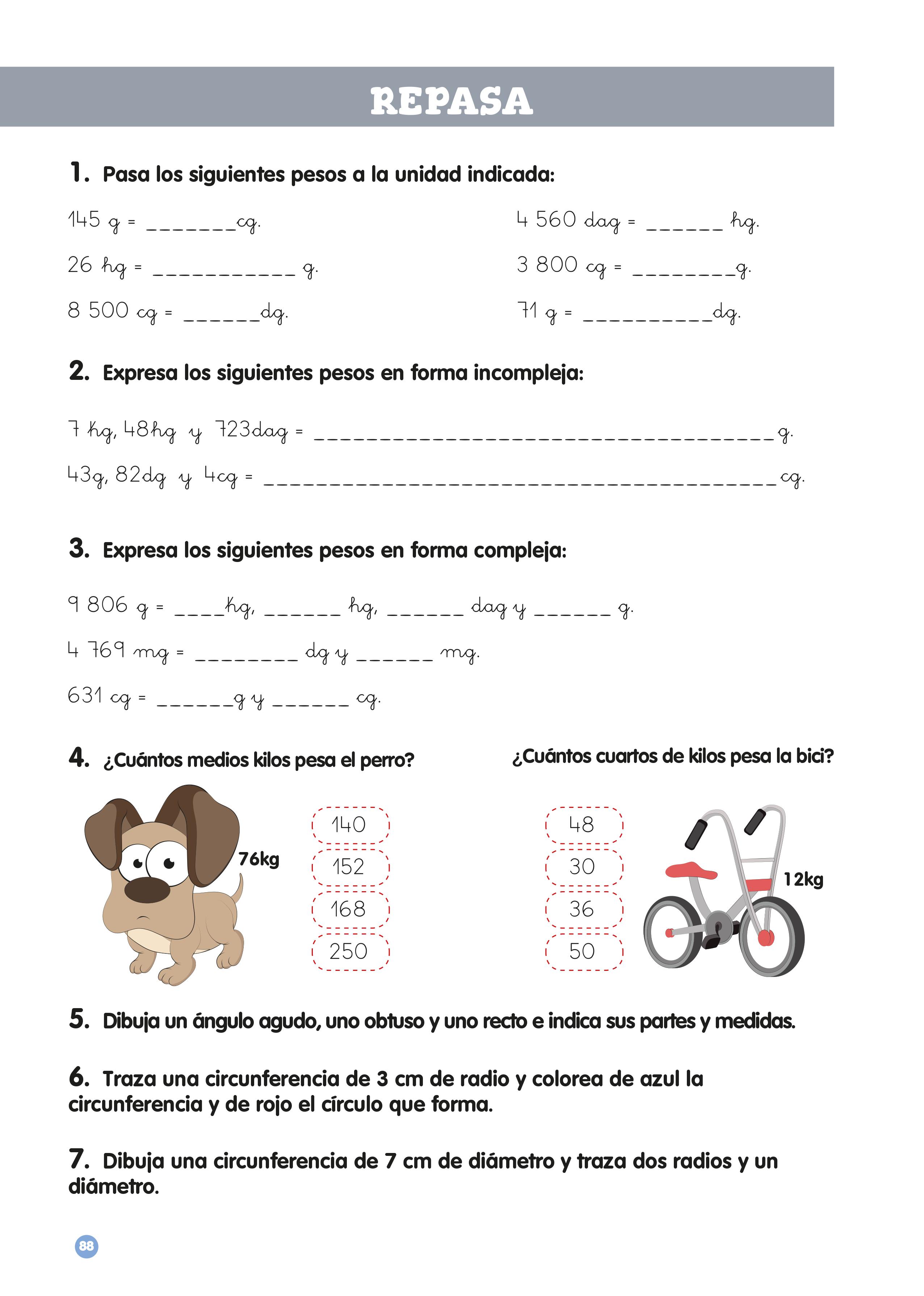 En el tercer ejercicio el alumno tiene que resolver operaciones con diferentes pesos.
